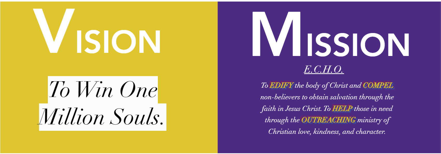 The Upper Room Christian Center held its first service on January 2, 2011 with an official membership of seven committed men and women of God. It was founded upon “going back to basics” in Acts 2:41-42. The vision God gave the ministry was very simple; To Win One Million Souls.